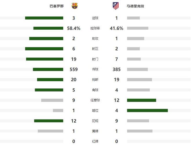 狂攻不止的巴萨,终于在第65分钟实现了反超,马竞球员顶弧附近围剿莱万解围失误,皮球落到了奥尔莫的脚下,后者抽射建功,帮助巴萨将比分改写为了2-1,仅仅过了4分钟马竞后防再出现低级失误,回传球直接给了亚马尔,但后者的兜射偏出,第79分钟马竞也浪费了一个进球良机,阿尔马达戏耍整条巴萨后防线之后,射门直接打偏,伤停补时阶段,费兰破门得分将全场比分定格为了3-1。