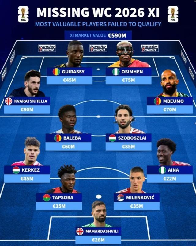 11月19日讯 德转社媒晒图,列出无缘2026世界杯球员中身价最高的首发阵容,奥斯梅恩、姆伯莫、K77、索博斯洛伊等多名球星在列。