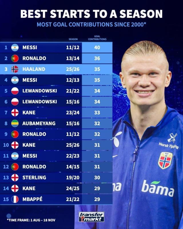 11月20日讯 德转统计了本世纪赛季开局的进球贡献数,哈兰德以35粒进球位居历史第三,仅次于梅西和C罗。